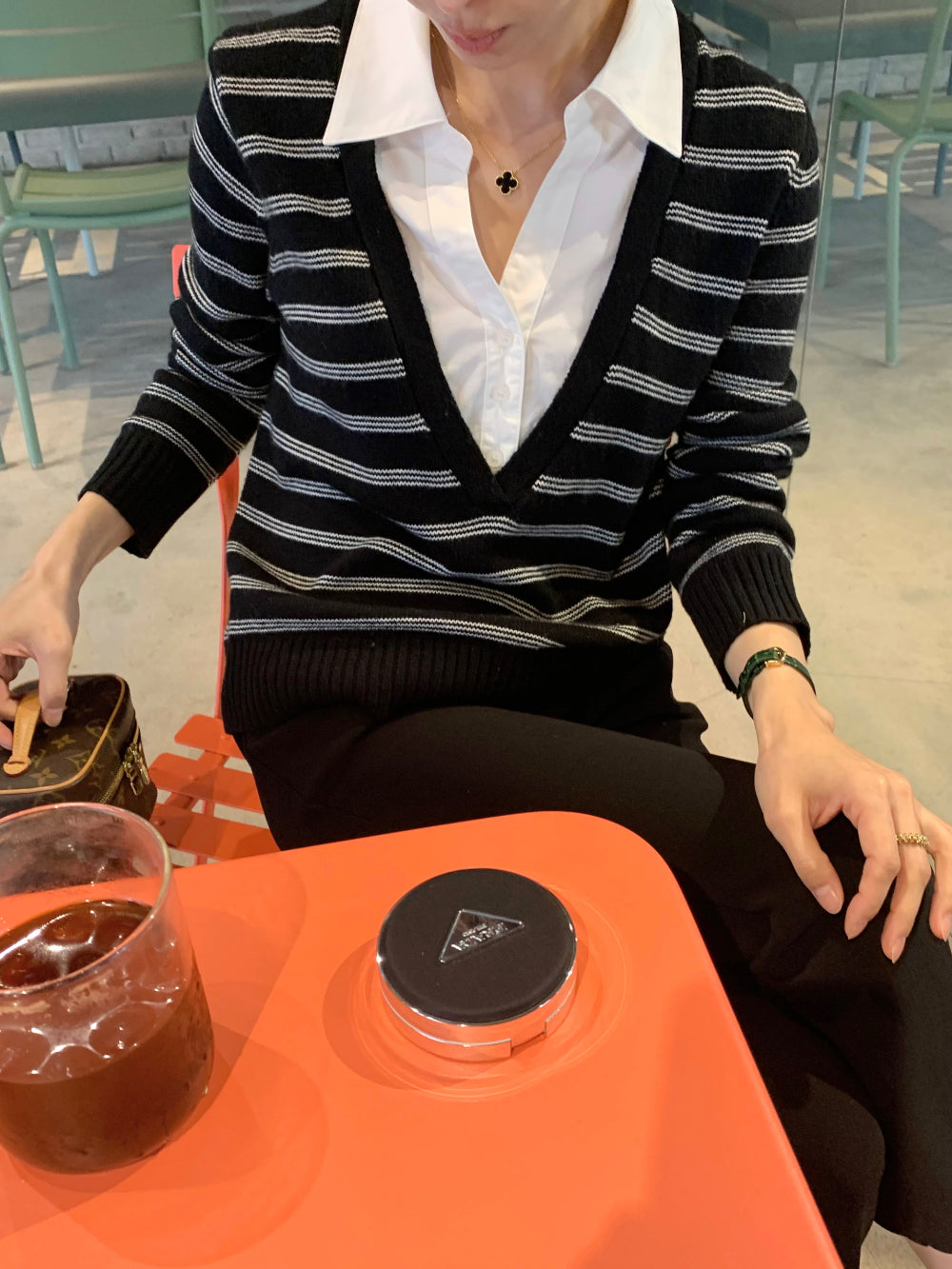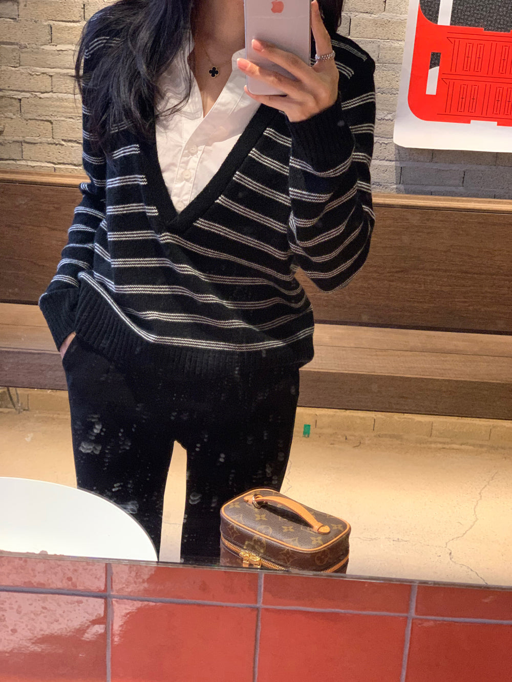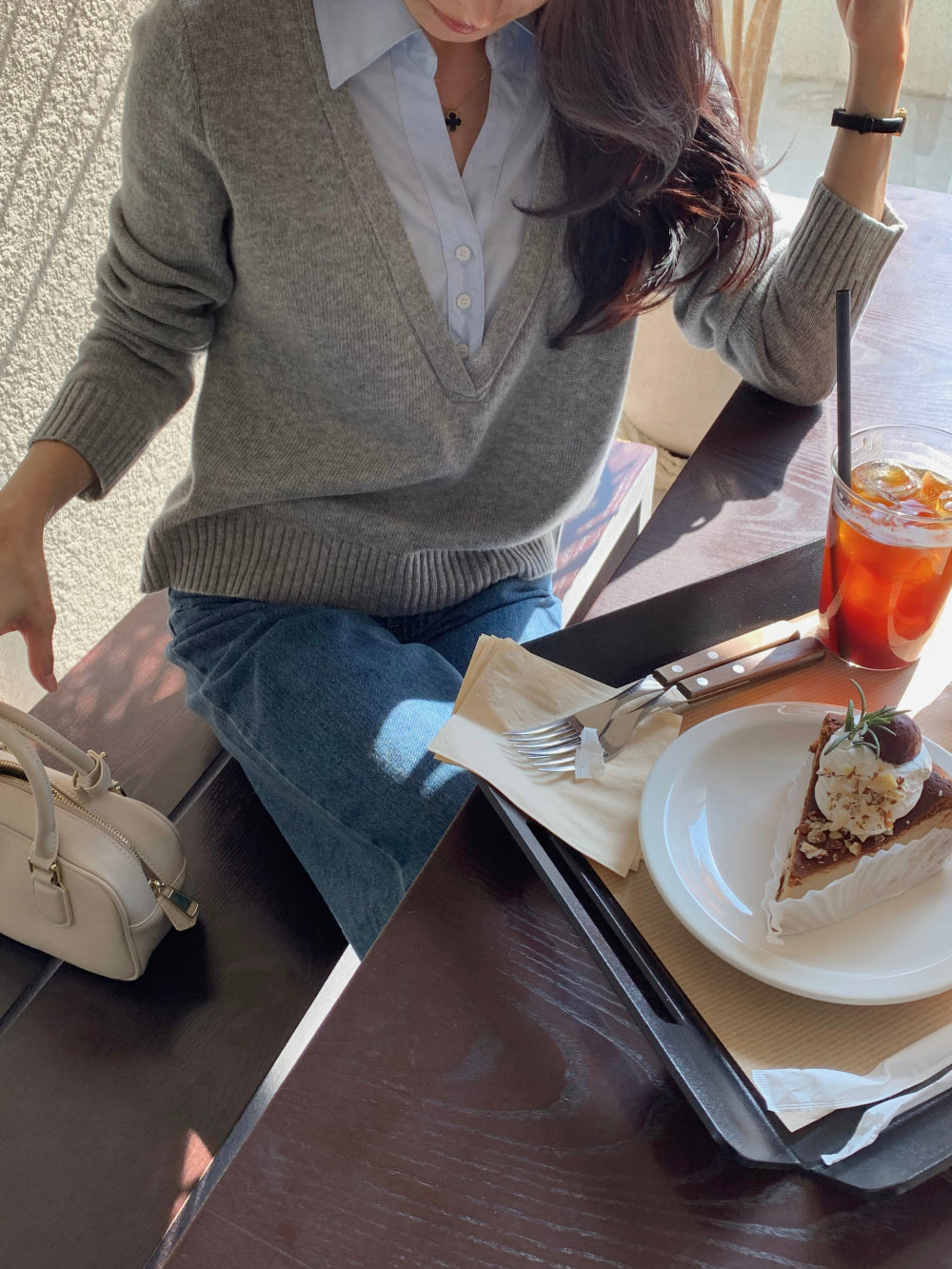 편안하고 넉넉한 핏으로 디자인되었으며, 깊은 V넥 라인은 상체를 슬림하게 보이게 하는 효과를 줍니다.