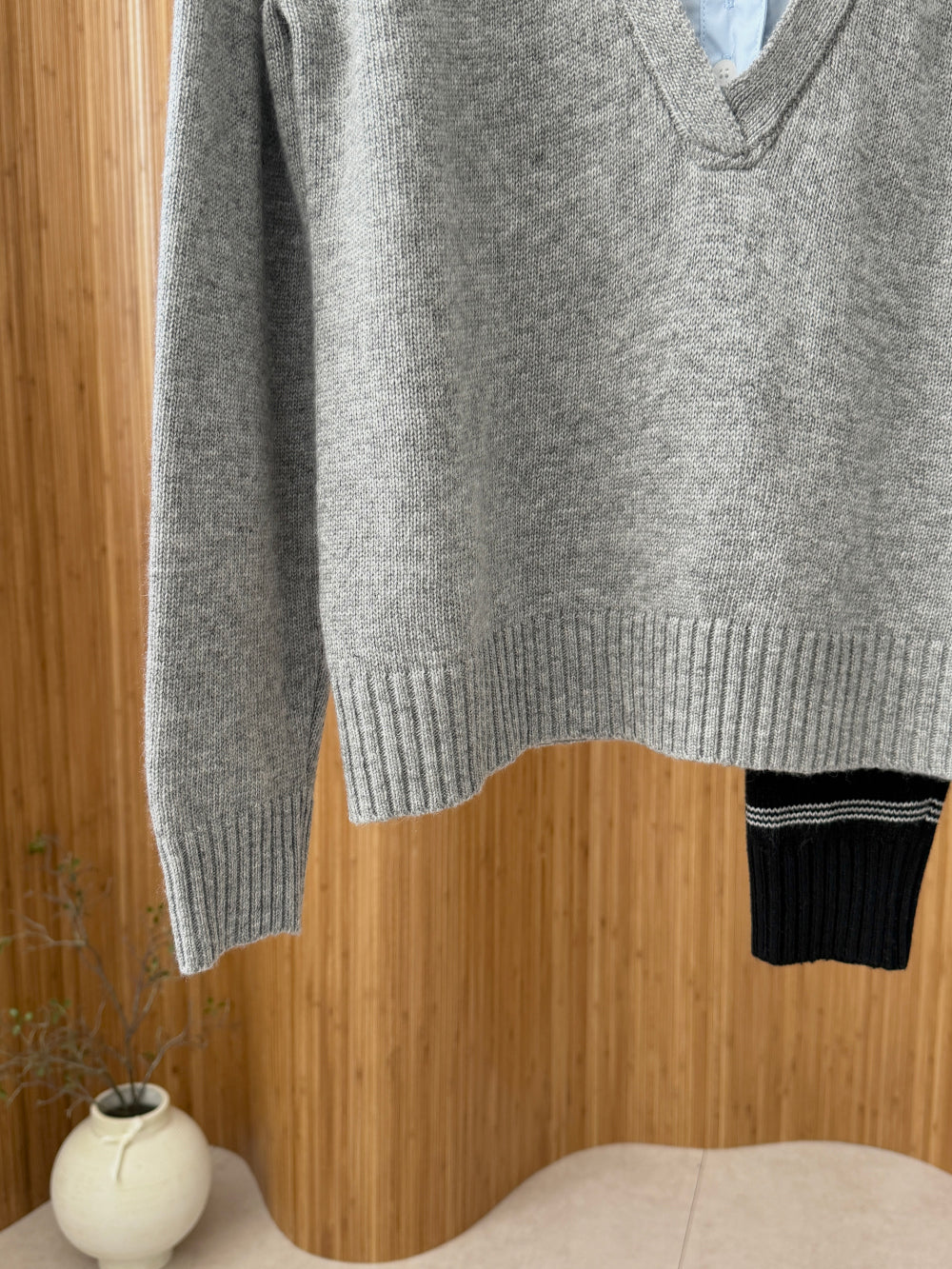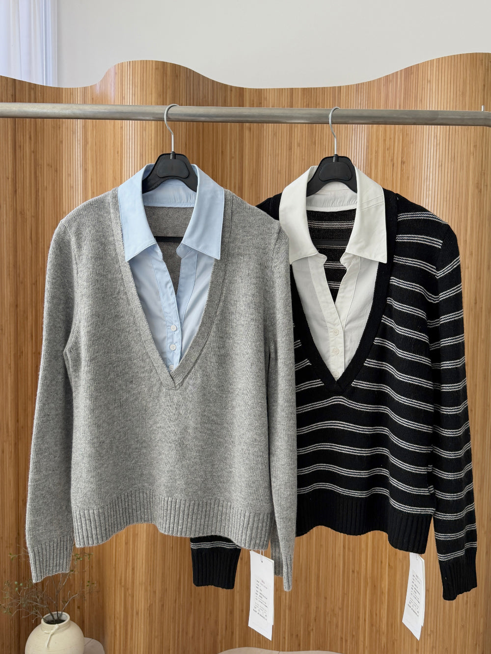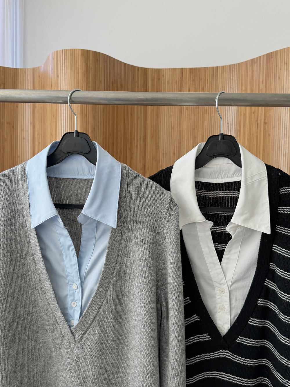 셔츠와 스웨터를 따로 겹쳐 입으면 부피감이 느껴지고 어색할 수 있지만, 이 투인원 레이어드 니트는 단 한 벌로 모든 문제를 해결해 줍니다.