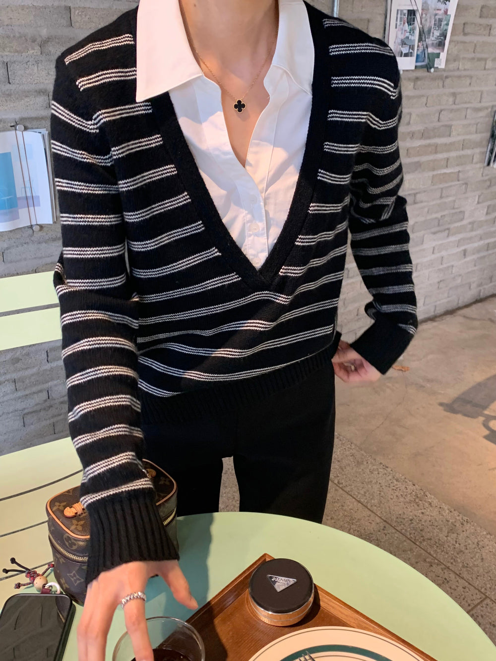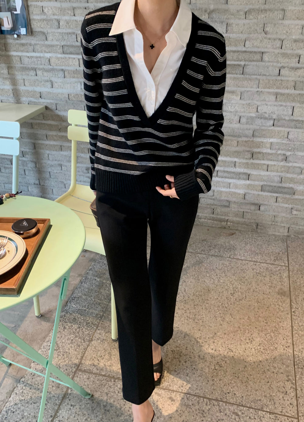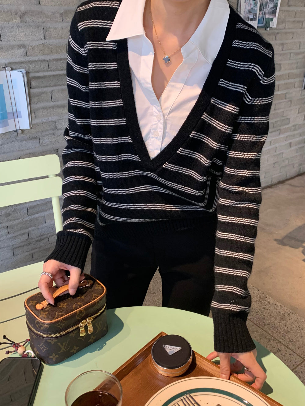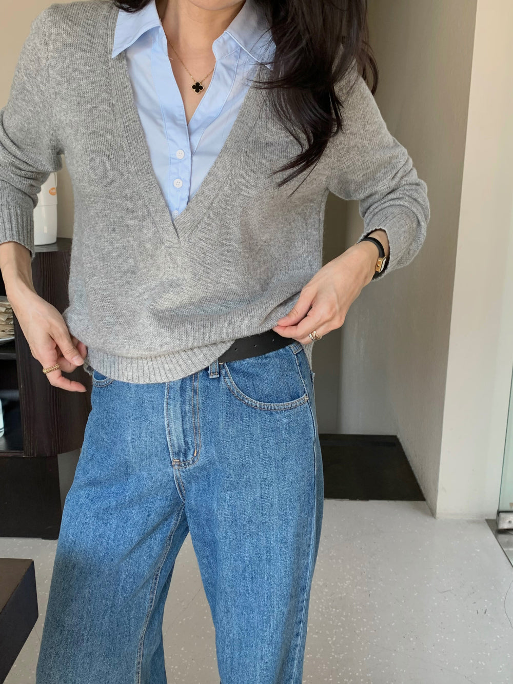 셔츠와 스웨터를 따로 겹쳐 입으면 부피감이 느껴지고 어색할 수 있지만, 이 투인원 레이어드 니트는 단 한 벌로 모든 문제를 해결해 줍니다.
