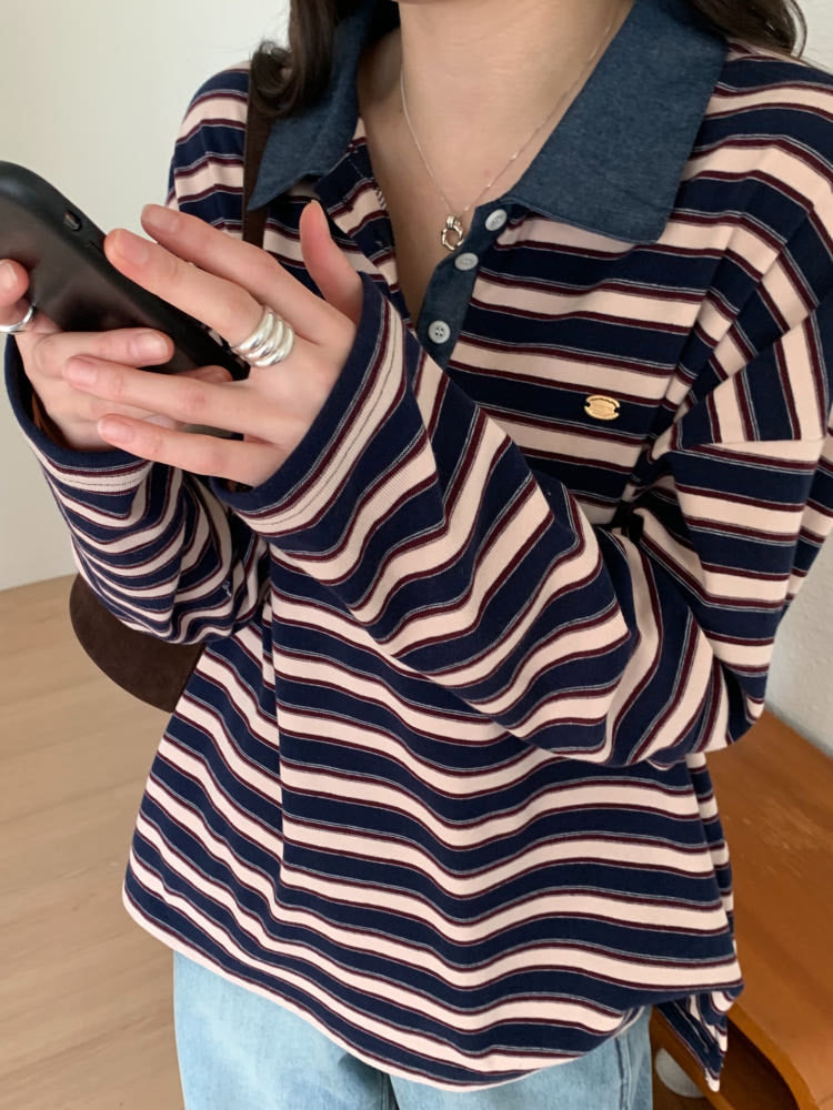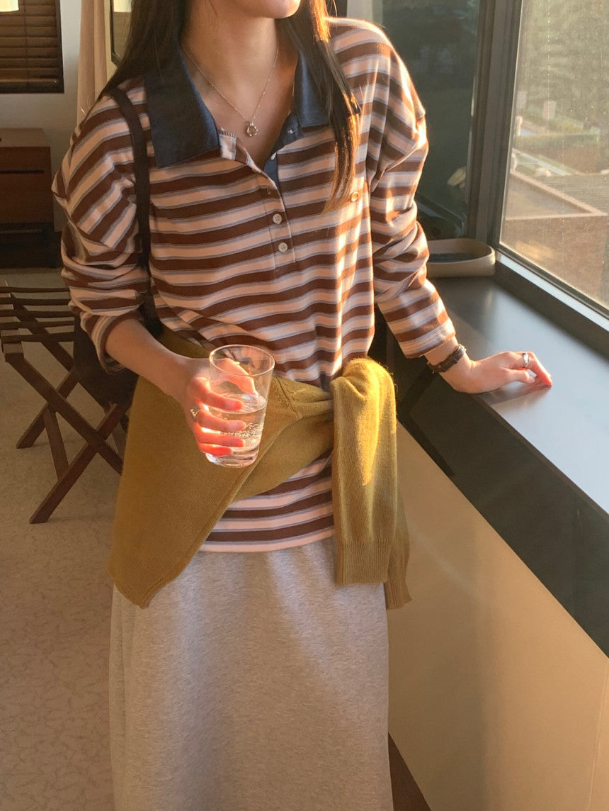 * Stripe Loose Fit Collar T-shirt